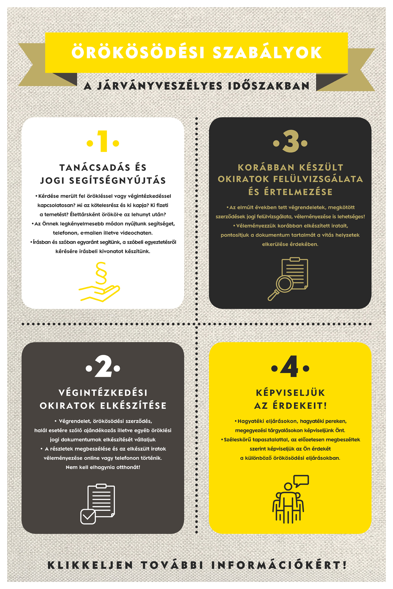 Az öröklési jog egy rendkívül összetett terület, amely számos kérdést vet fel. Segítünk megválaszolni őket, tiszta és érthető jogi hátteret biztosítva a hagyatéki ügyek intézéshez. Lehetőségük van telefonon vagy online is igénybe venni a szolgáltatásainkat, így – nem csupán a járványveszély miatt karanténban lévő de – a vidéken vagy külföldön élő ügyfeleink ügyeit is gördülékenyen tudjuk intézni.