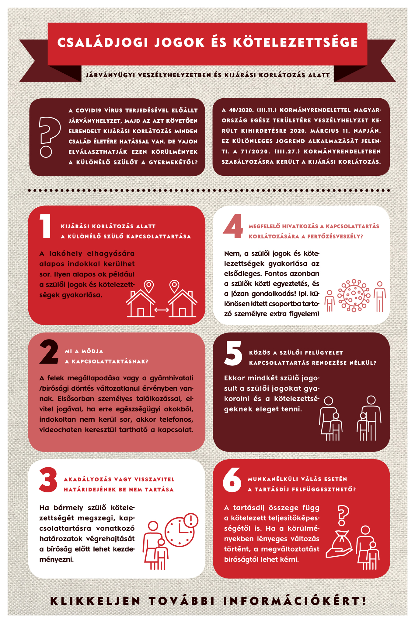 A szülők munkahelyétől függetlenül a különélő szülő kapcsolattartásra jogosult és köteles a szokásos rend szerint. Ha valamilyen oknál fogva a gyermek a járványügyi helyzetnek különösen kitett, veszélyeztetett, úgy a szülőknek mérlegelniük kell. A gyermek egészséges fejlődése érdekében a rendkívüli helyzetre tekintettel különösen fontos, hogy a szülők egymással egyeztessenek és olyan megállapodást találjanak, amely minden érintett számára megnyugtatóan rendezi a vitás helyzetet.